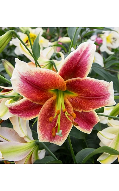 Луковицы лилии OT гибрид гигант.Размер луковицы 12/14.Высота растения: до 200 см.Производитель: Голландия.Лилия Zagora (Загора) относится к ОТ-гибридам. Цветки крупные, диаметром до 24 см, направлены в сторону и вниз. Лепестки бледно-желтые с большим удлиненным красным пятном в центре, края слегка в... →