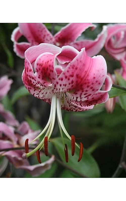 Лилия Speciosum Rubrum - прекрасная лилия. Цветки белые, покрытые рельефными крапинами и штрихами ярко- малинового цвета, настолько густыми, что они практически сливаются в сплошные пятна . Лепестки , сильно завернутые вверх, образуют чалмовидный цветок диаметром до 10 см , с нежным ароматом. В одном соцветии - от 2 до 20 цветов. Высота растения до 130 см.