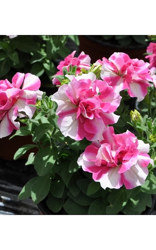Петуния мультифлора Дуо Роуз Вайт (Petunia multiflora Duo Rose White) - изысканная серия махровой, крупноцветной петунии американской компании "PanAmerican Seed", которая является одним из ведущих мировых производителей семян цветов. Кусты петунии Дуо компактные, хорошо разветвленные, высотой 20-38 см. Растение обильно покрыто махровыми, сочными, розово-белыми цветами, диаметром 5 - 5.5 см.
