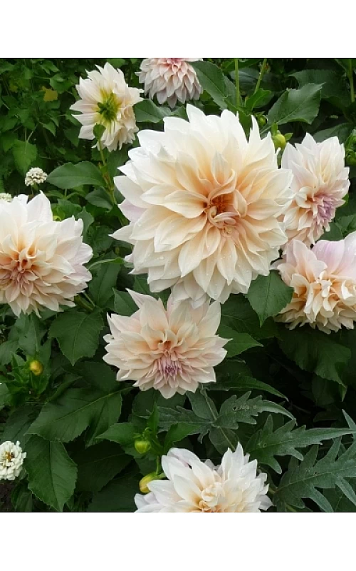 Колір жоржини Cafe Au Lait не так просто описати, адже під дією сонячної або похмурої погоди, а також складу грунтів, він може видозмінюватися в тонах. Білосніжні бутони переливаються в кремових, тілесних, рожевих, лілових і персикових тонах. Пелюстки, розташовані у центру, трубчасті, невеликі, а нижні ряди більш розкриті і округлі. Квітка дуже великий діаметром до 30 см. Термін цвітіння жоржин сорти Cafe Au Lait приємно дивує, так як становить близько трьох місяців, починаючи з липня. Сильнорослий дорослий кущ досягає 120 см, стебла пружні і гладкі світло-зелені, листя різьблені і шкірясті. Георгіна даного сорту є чудовою прикрасою літньо-осіннього саду, а також підходить для зрізання.