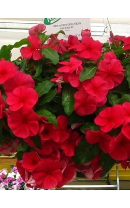 Катарантус ампельних Медітер F1 (Catharanthus roseus Mediterranean F1). Крупноквіткова серія для підвісних кошиків і кашпо. Висота 10-15 см, ширина 51-76 см, діаметр квітки 4-5 см. Цвітіння рясне і тривале. Рослина сильноросла, швидко заповнює посадкову ємність. На перших етапах зростання вертикальний, потім пагони починають звисати. Відрізняється стійкістю до спеки, посухи, толерантністю до хвороб і шкідників. Відмінний вибір для вертикального озеленення. Можна вирощувати як почвопокровного рослини.