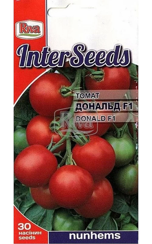 Насіння томату Дональд F1 (Donald F1). Виробник Nunhems Zaden (Голландія). Плоди округло-овальні. Для цільноплідного консервування, переробки та вживання в свіжому вигляді.